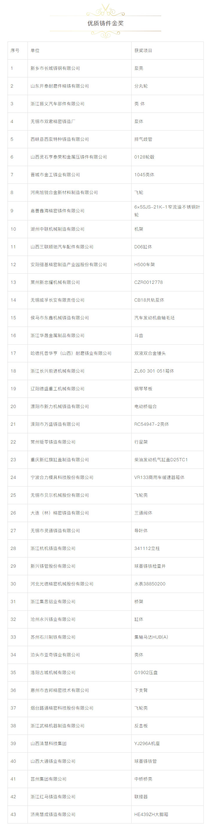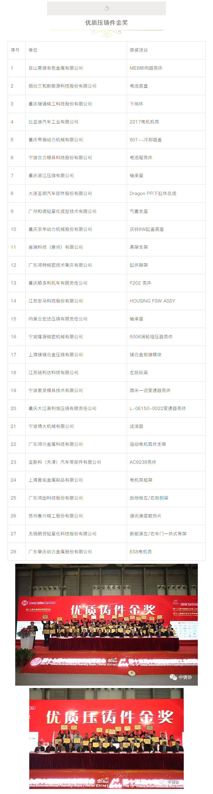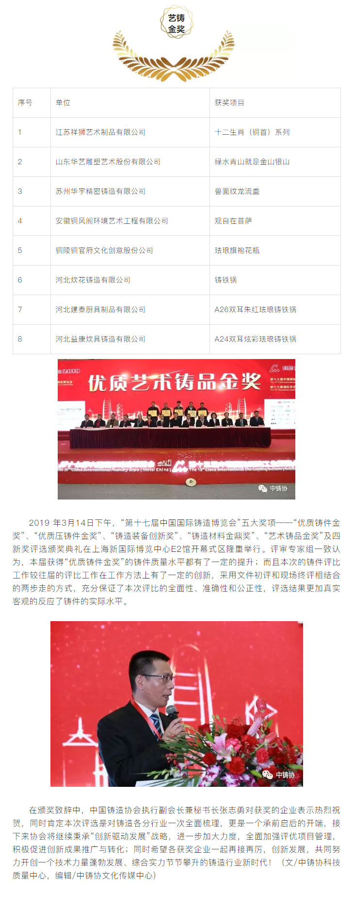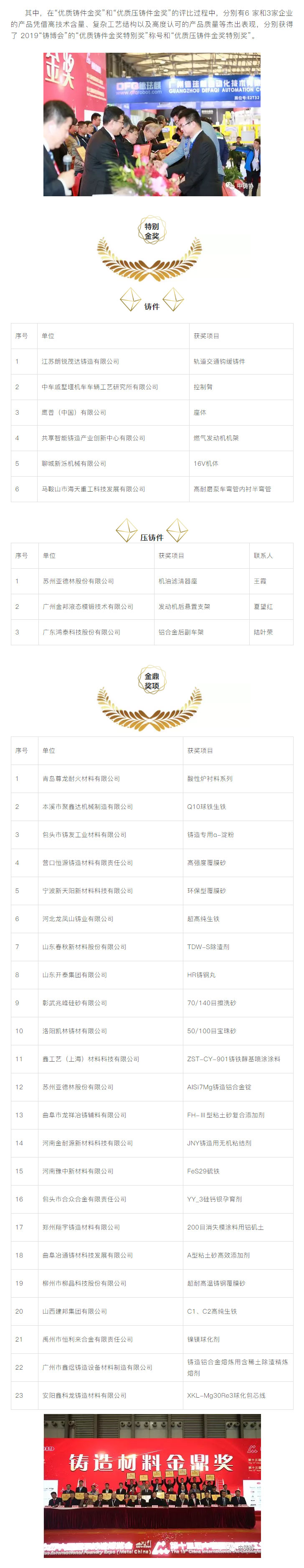 為了進(jìn)一步鼓勵(lì)鑄造行業(yè)科技創(chuàng)新,推動(dòng)鑄造行業(yè)質(zhì)量工作,更好地服務(wù)于鑄造行業(yè)轉(zhuǎn)型升級(jí),本著“評先獎(jiǎng)優(yōu)”’的原則,中國鑄造協(xié)會(huì)在“第十七屆中國國際鑄造博覽會(huì)”及“第十三屆中國國際壓鑄工業(yè)展覽會(huì)”期間,繼續(xù)對參展的鑄件、壓鑄件、鑄造裝備、鑄造材料、藝術(shù)鑄品及四新技術(shù)開展了評比活動(dòng)。本次評選活動(dòng)得到廣大參展商的大力支持,共有154家企業(yè)的200余件展品參與申報(bào)評優(yōu)。
